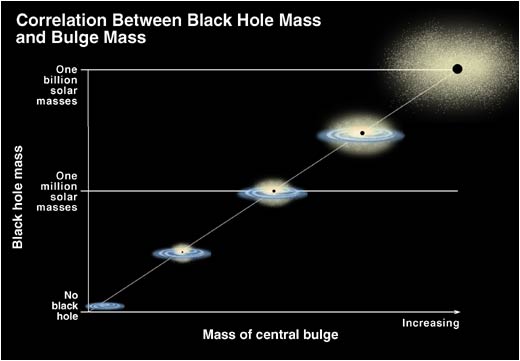 The relationship between the mass of the supermassive black hole and host galaxy properties is known as the “black hole – galaxy relation.” The ubiquity of supermassive black holes in the local universe as well as in distant quasars, coupled with the strong correlations, suggest some kind of cosmic link between the growth of galaxies and the growth of supermassive black holes. The nature of the link is puzzling, because supermassive black holes are typically only about 1/1000th the mass of their host galaxy bulges (see here for a an exception to this), which means they exert effectively no direct gravitational influence on the stars in the galaxies.